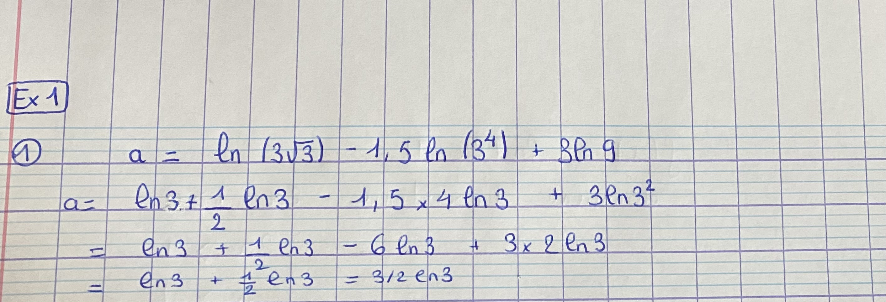 avec cela tu vas pouvoir transformer ln(3\(\sqrt{3}\)) et ln(9) = ln(3²) et ainsi simplifier a ...