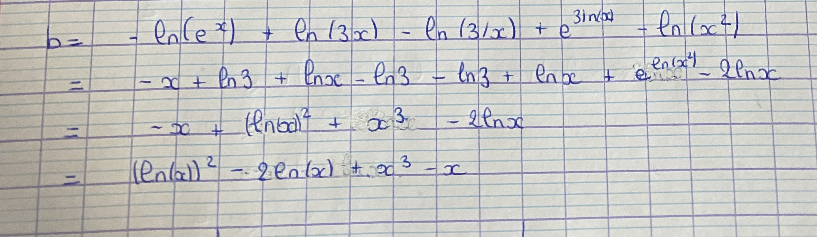 2. b= -ln(e^x) + ln (3x)- ln (3/x ) + e^3lnx - ln (x^2)