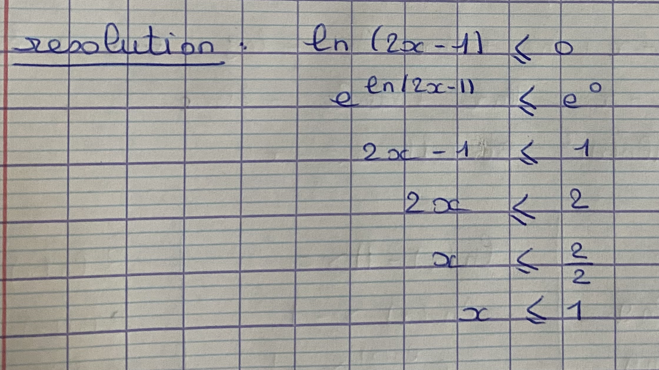 Ce sera la même chose avec ton autre inéquation \(\ln(2x-1)\leqslant 0\) qui est définie pour \(2x-1>0\) soit pour \(x>\dfrac{1}{2}\).