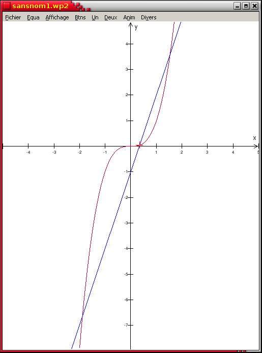 Si l'équation est \(x^3-3x+1=0\), alors tu étudieras les intersections de la courbe d'équation \(y=x^3\) et de la droite d'équation \(y=3x-1\) (et pas \(y=3x+1\))