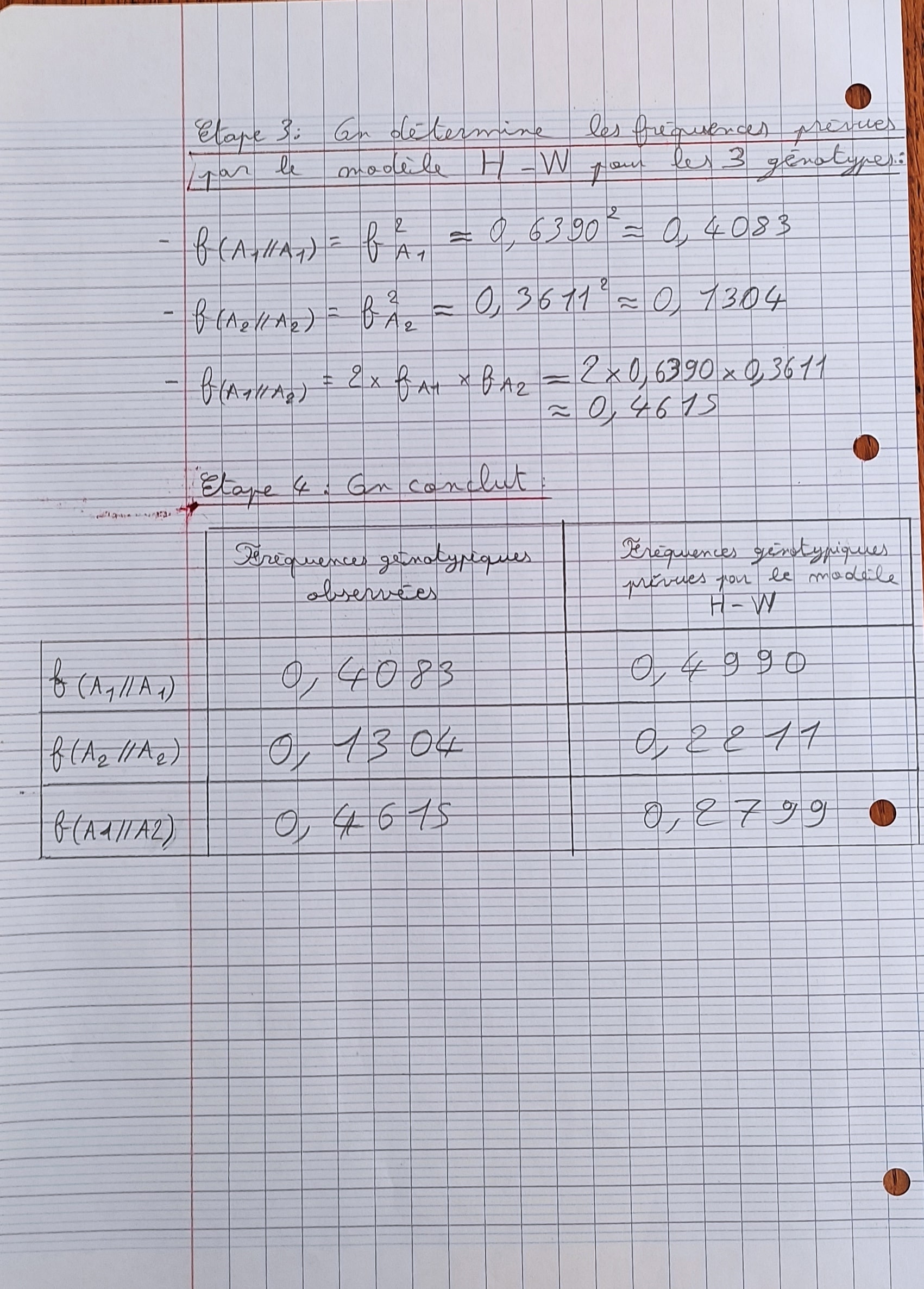 Ta démarche pour étudier l'équilibre de Hardy-Weinsberg est juste. Par contre, dans ton dernier tableau, tu as inversé les valeurs numériques des deux colonnes. Il ne reste qu'à conclure. Pour cela compare les fréquences observée à celles attendues par le modèle.