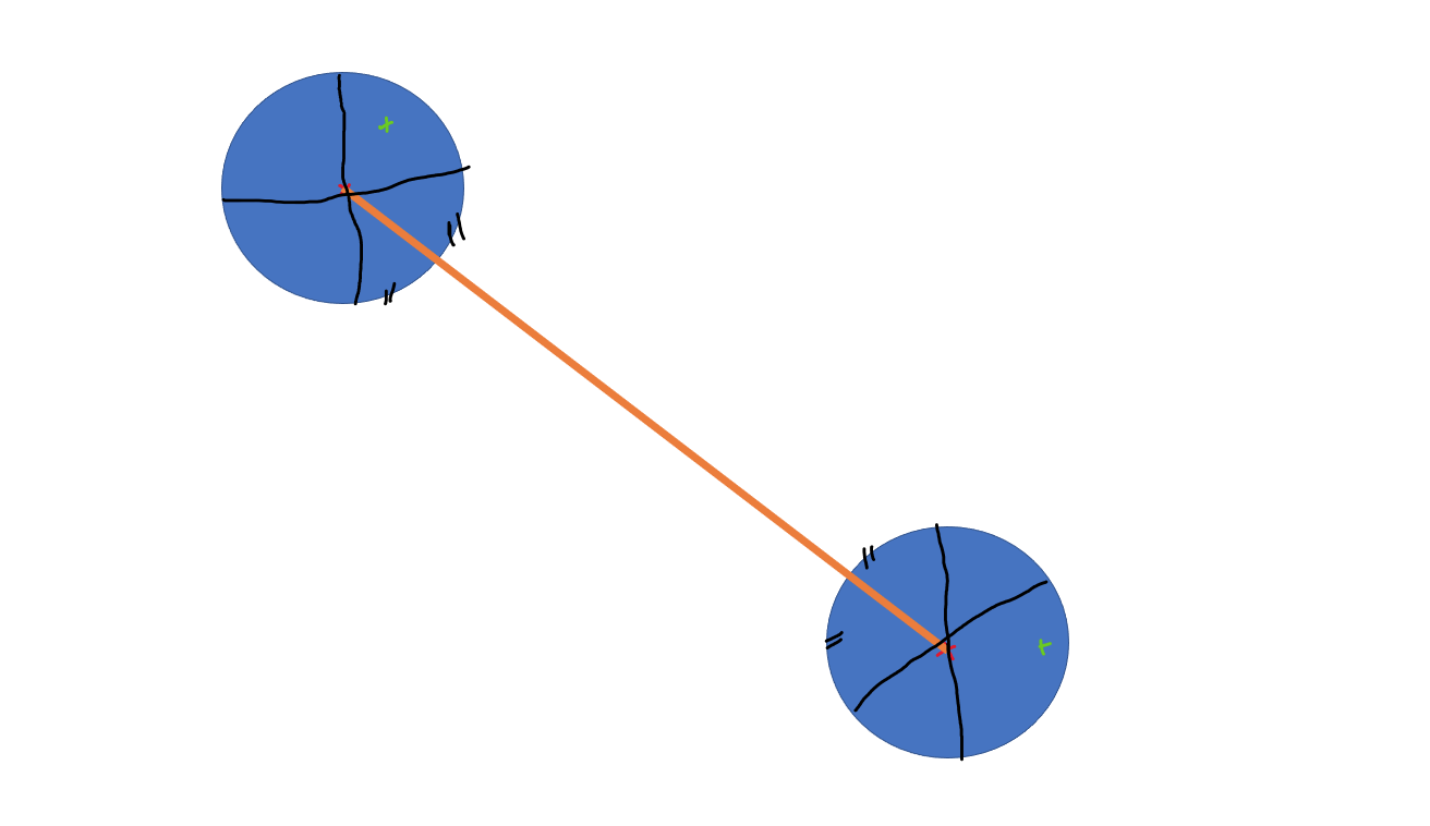 Chaque cercle bleu symbolise une cellule. La petite croix rouge au centre des cercles bleus représente son centre géométrique. Le trait orange est un segment qui relie le centre des deux cercles.