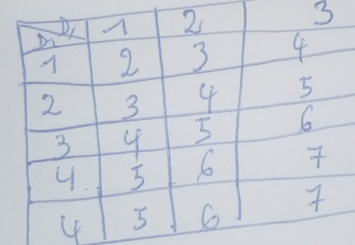 Une fois que tu auras résolu ton problème d'énoncé sur le dé cubique n°2, je te conseille de prendre déjà un cas particulier avec par exemple n = 0 ( donc le dé numéro 1 est marqué 1; 3;3; 3; 3; 3) et refaire ton tableau ( 7 lignes, 7 colonnes) pour avoir toutes les sommes possibles.