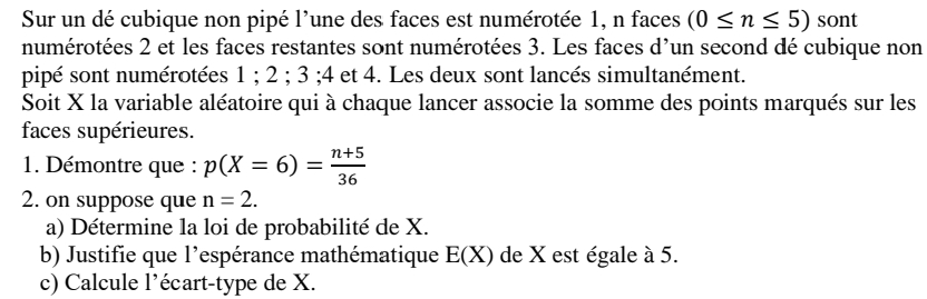 Sur un dé cubique non pipé l’unedes faces est numérotée 1, n faces (0≤𝑛≤5)sont