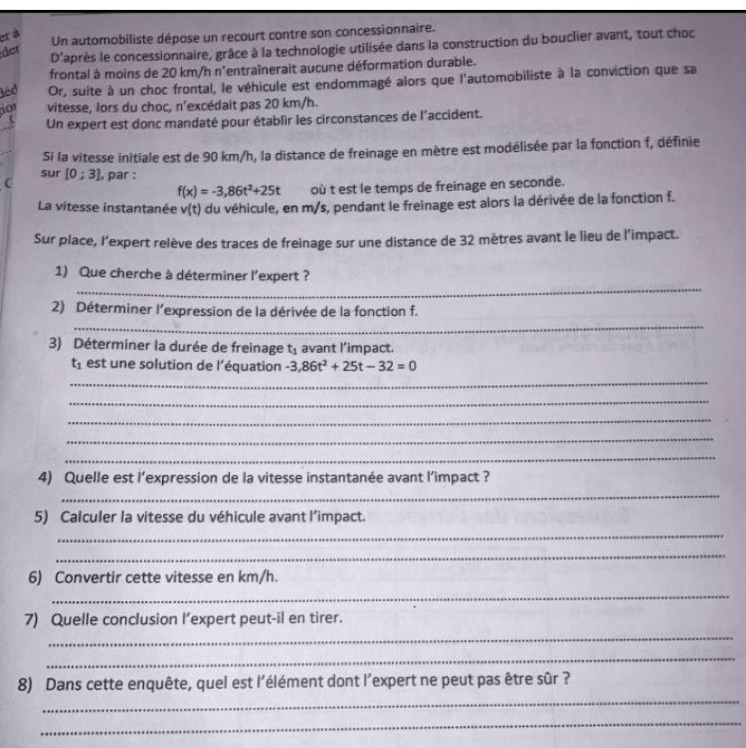 Donc pour la question 4, il te faut calculer la dérivée de \( f(t)= -3,86t^2+25t\)