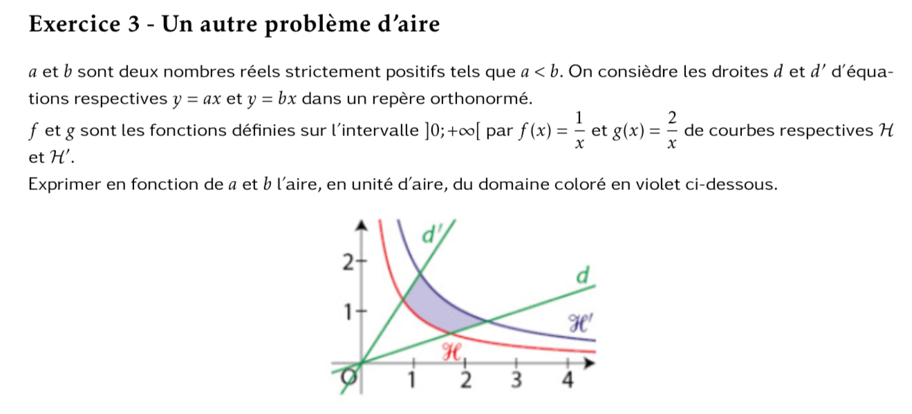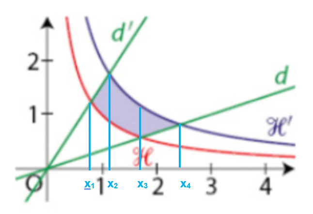Merci pour votre aide. J’ai d’abord chercher déjà les 4 points d’intersections. J’ai déjà résolu ax=2/x d’où X= racine (2/a) ensuite bx = 1/x équivaut à X =racine(1/b) ect pour