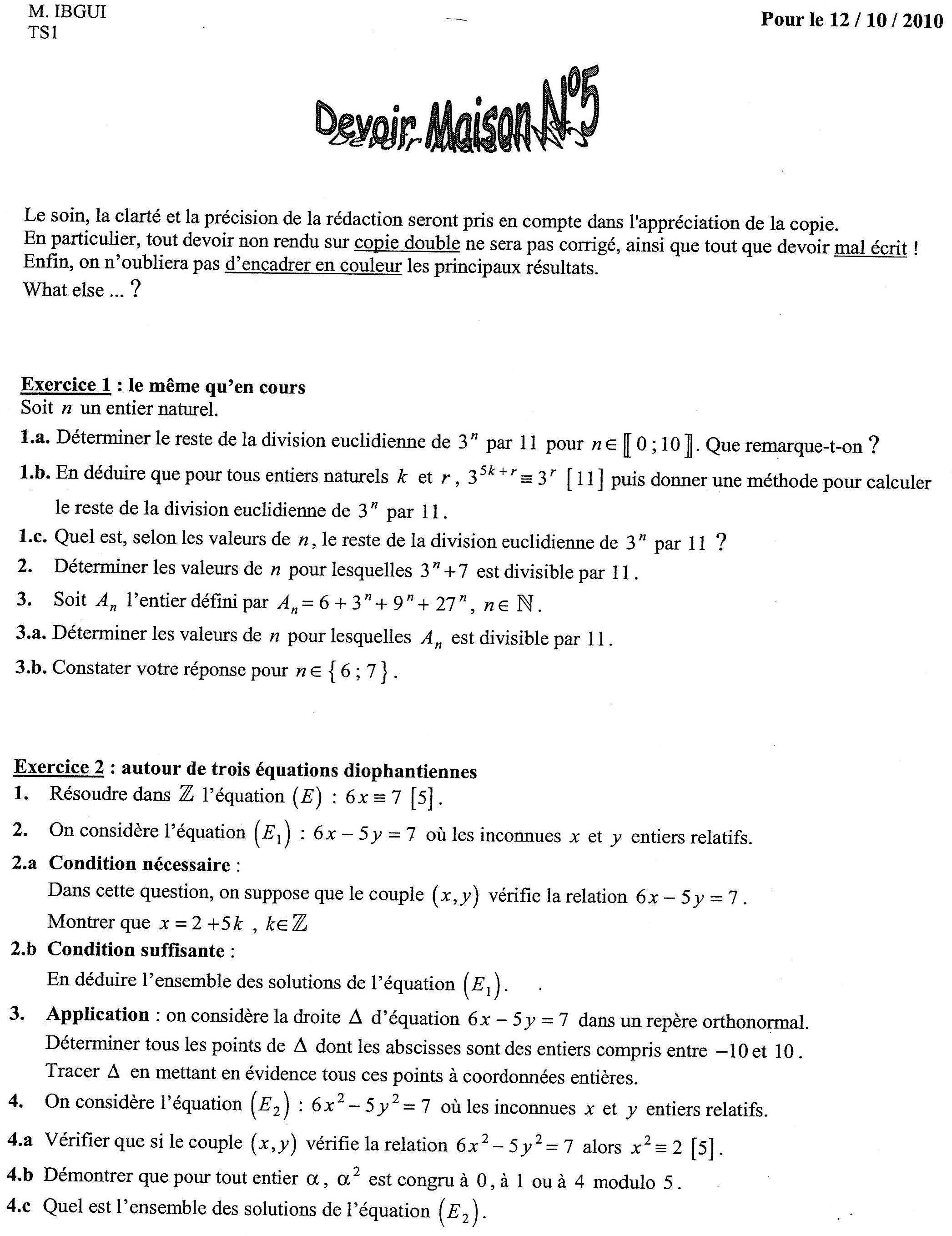 Ensuite pour l'équation vous obtenez 6x = 5y + 7 avec y entier soit 6x congru à 7 modulo 5, ce qui renvoie à la question 1.