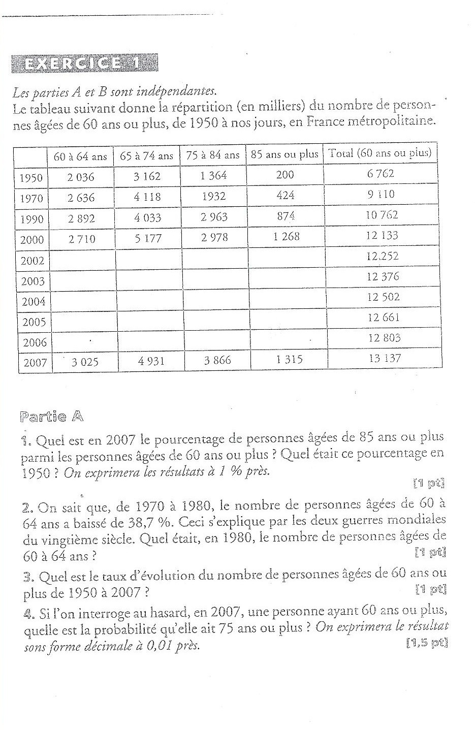 Le tableau suivant donne la répartition (en milliers) du nombre de personnes âgées de 60ans ou plus, de 1950 à nos jours, en France métropolitaine.