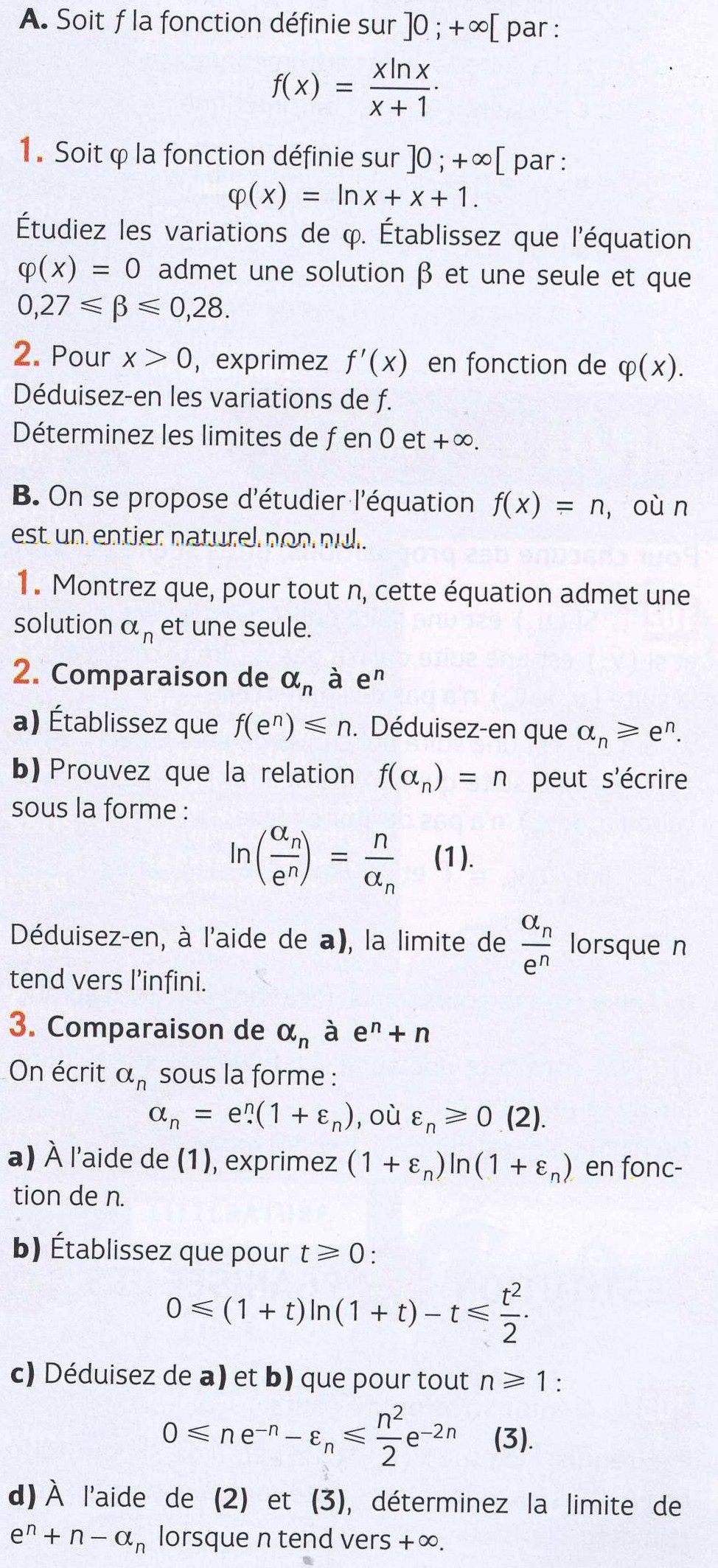 Sinon, pour la question B.3.b), j'a posé f(t)=(1+t).ln(1+t)-t, j'ai ensuite calculé sa dérivée et son minimum f(0)=0, j'ai donc pu prouver l'inégalité 0 ≤ (1+t).ln(1+t)-t.