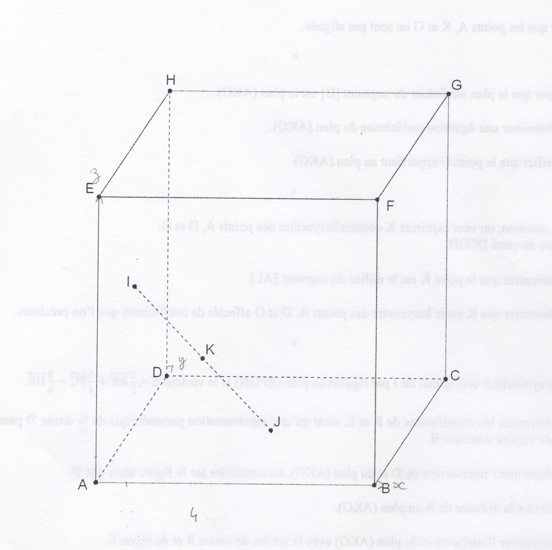 Je ne suis pas d'accord pour J, il est dans le plan d'équation z = 0 puisque le cote est donnée par \(\vec{k}=\frac{1}{4}\vec{AE}\). De même pour K non plus.