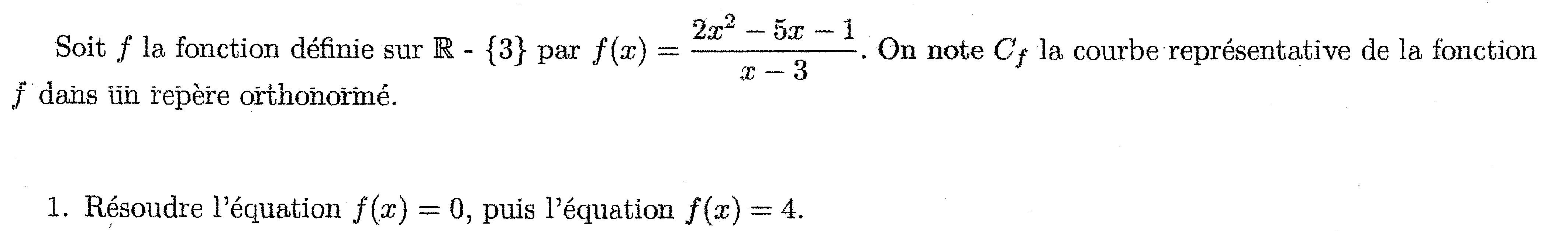 Pour résoudre f(x) = 4 il suffit de résoudre \(2x^2-5x-1=4(x-3\) et de vérifier que les solutions sont différentes de 3.
