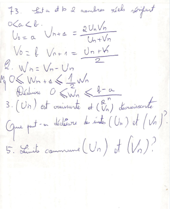 Pour calculer la limite \(l\) commune tu commences par expliquer pourquoi \(l\) ne peut pas être égal à 0, puis tu "passes à la limite" dans l'égalité : \(V_{n+1}=\frac{2U_nV_n}{U_n+V_n}\). Tu obtiens \(l=\frac{2l^2}{l+l}\).
