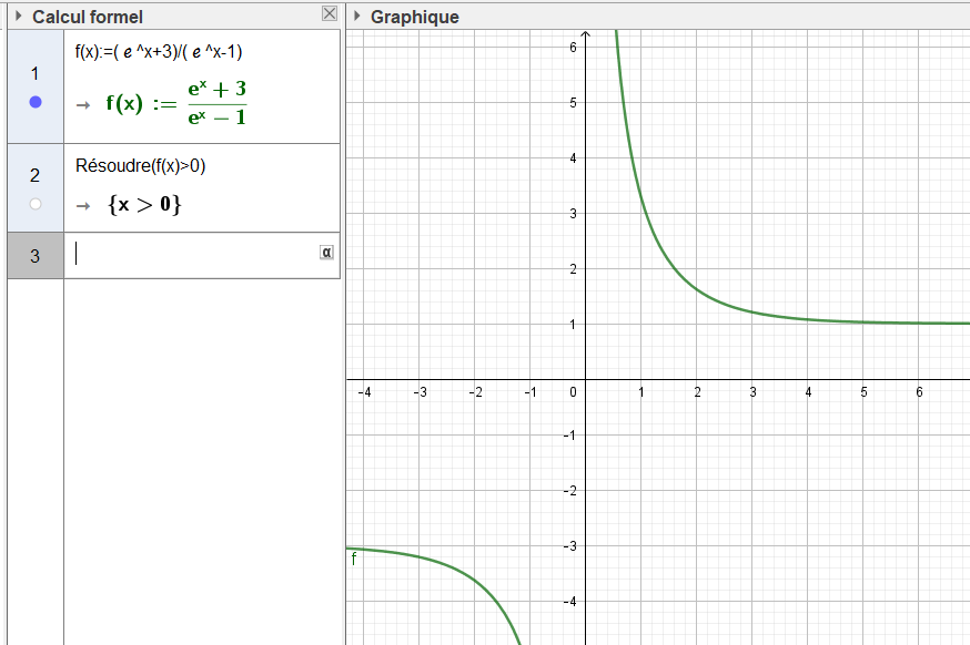 Je comprends mieux … il te manquait beaucoup de parenthèses … ((e^x)+3)/((e^x)-1) > 0.