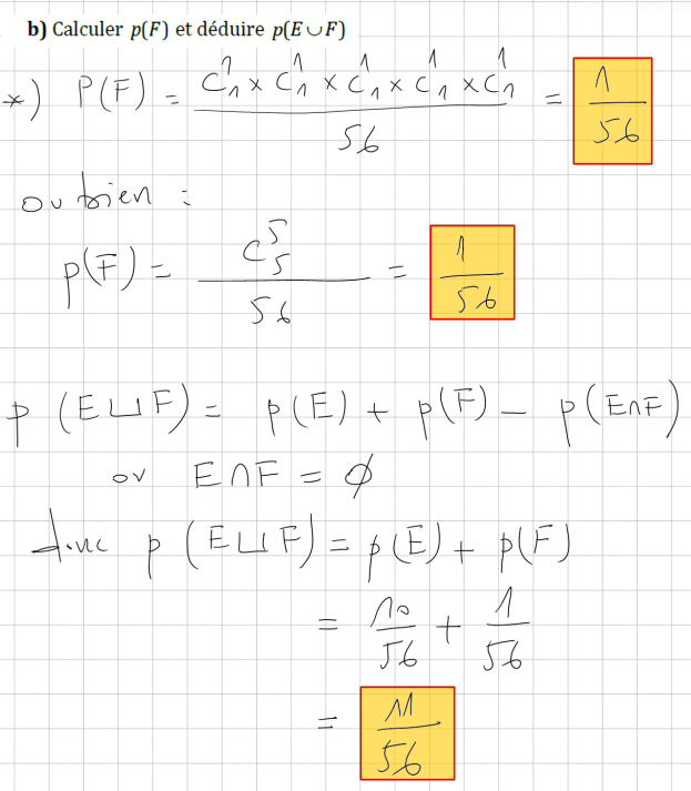 \(P(E\cup F)=P(E)+P(F)-P(E\cap F)=\frac{5}{28}+\frac{1}{56}-\frac{5}{28}*\frac{1}{56}=\frac{303}{1568}\) pouvez vous m'aider?