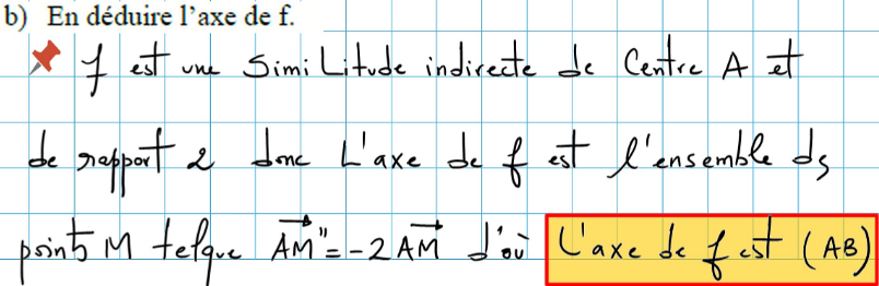 Or d'après la question 4a, l'ensemble des points M du plan qui vérifie \(\vec{AM"}=-2\vec{AM}\) est la droite (AB), donc l'axe de f est la droite (AB).