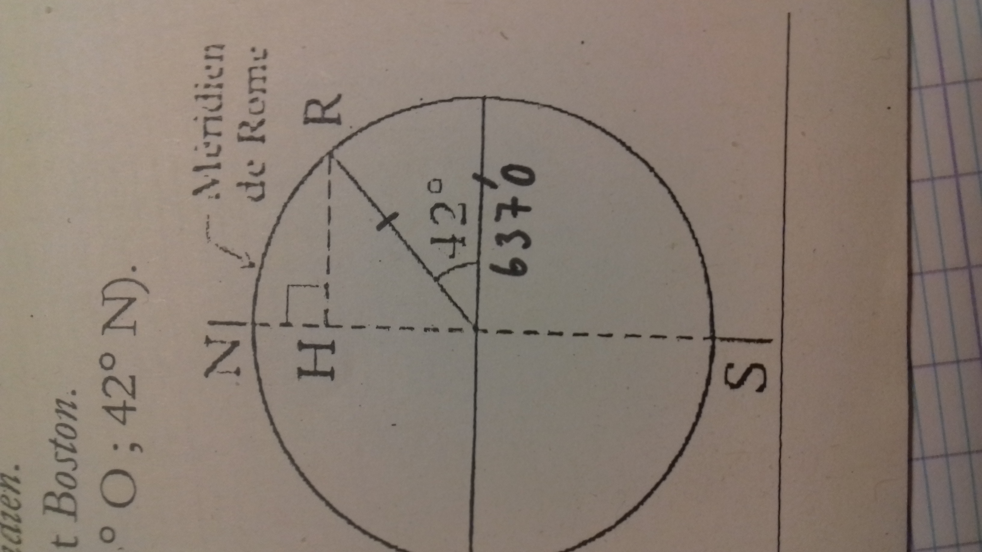 Pour déterminer la longueur du parallèle de Rome (c'est le cercle de centre H et de rayon HR) il faut trouver le rayon HR. Regarde bien, je pense que tu peux trouver un triangle particulier dans lequel travailler et calculer cette longueur.