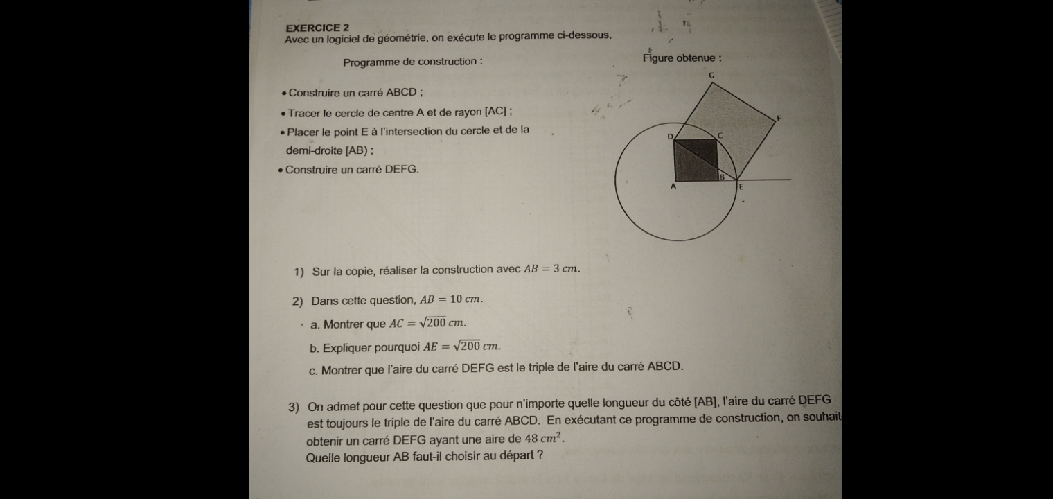 Par ailleurs, tu écris \(\mathcal{A}=300\) puis \(\mathcal{A}\approx 17,8\,\text{cm}^2\) : c'est faux.Ton aire de carré est égale à 300 cm\(^2\) et c'est tout il n'y a pas à reprendre de racine carrée pour exprimer une aire. Même remarque pour l'aire de \(ABCD\) qui vaut 100 cm\(^2\).