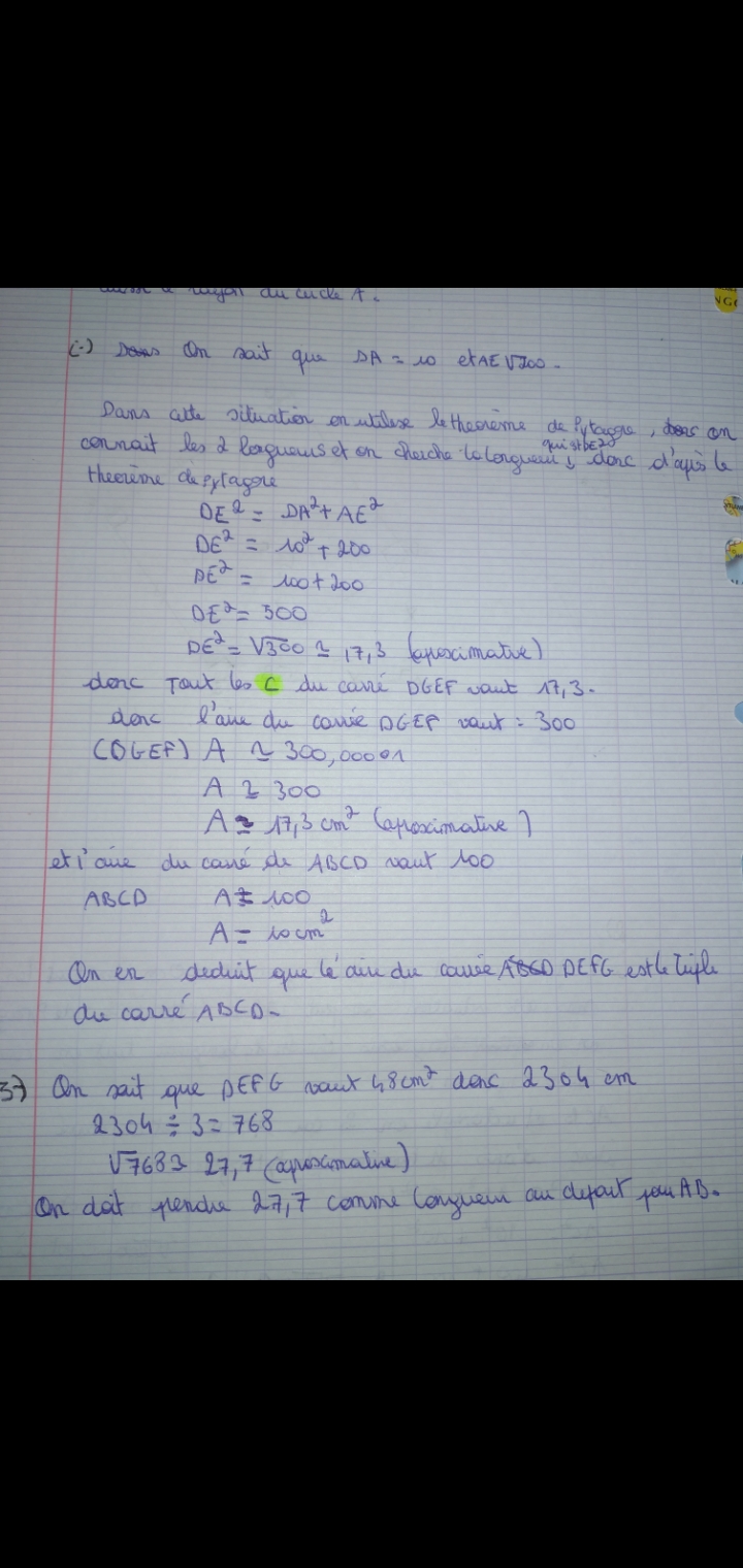 Quand tu appliques Pythagore, tu écris sur une ligne \(DE^2=\sqrt{300}\), ce qui n'a pas de sens : la racine carré et le carré ne peuvent pas intervenir dans une même ligne de calcul car ce sont deux opérations inverses l'une de l'autre : on a \(DE^2=300\) et cela devient \(DE=\sqrt{300}\).