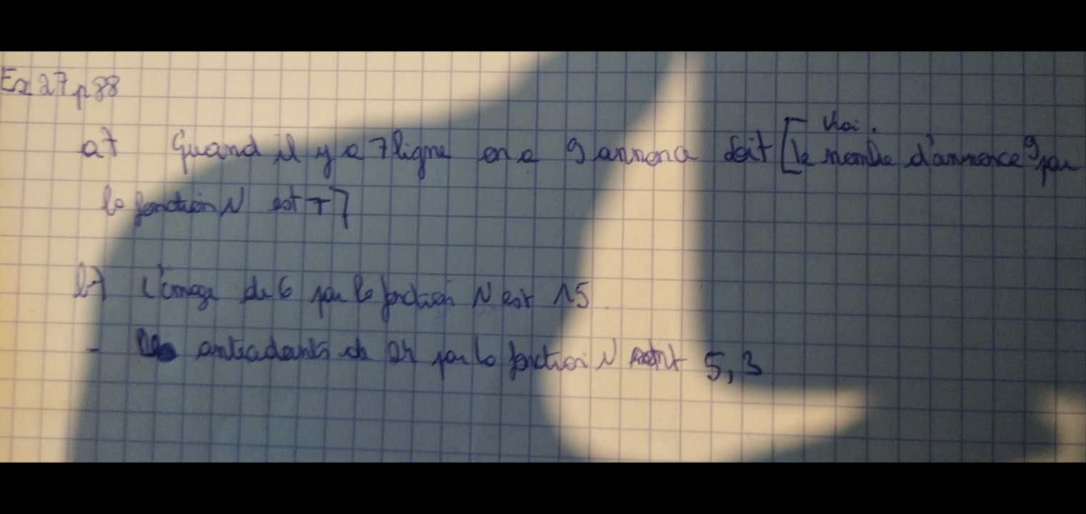 si on reste dans le contexte de l'exercice, l'écriture \(N(7)=9\) signifie qu'il y a 9 petites annonces qui comportent 7 lignes, ou encore le nombre de petites annonces comportant 7 lignes est égal à 9. Avec le vocabulaire des fonctions, cela se traduit en disant que l'image de \(7\) par la fonction \(N\) est \(9\), ou encore \(9\) est l'image de \(7\) par la fonction \(N\).