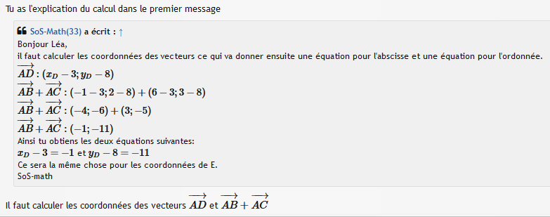 Il faut calculer les coordonnées des vecteurs \(\overrightarrow{AD}\) et \(\overrightarrow{AB}+\overrightarrow{AC}\)