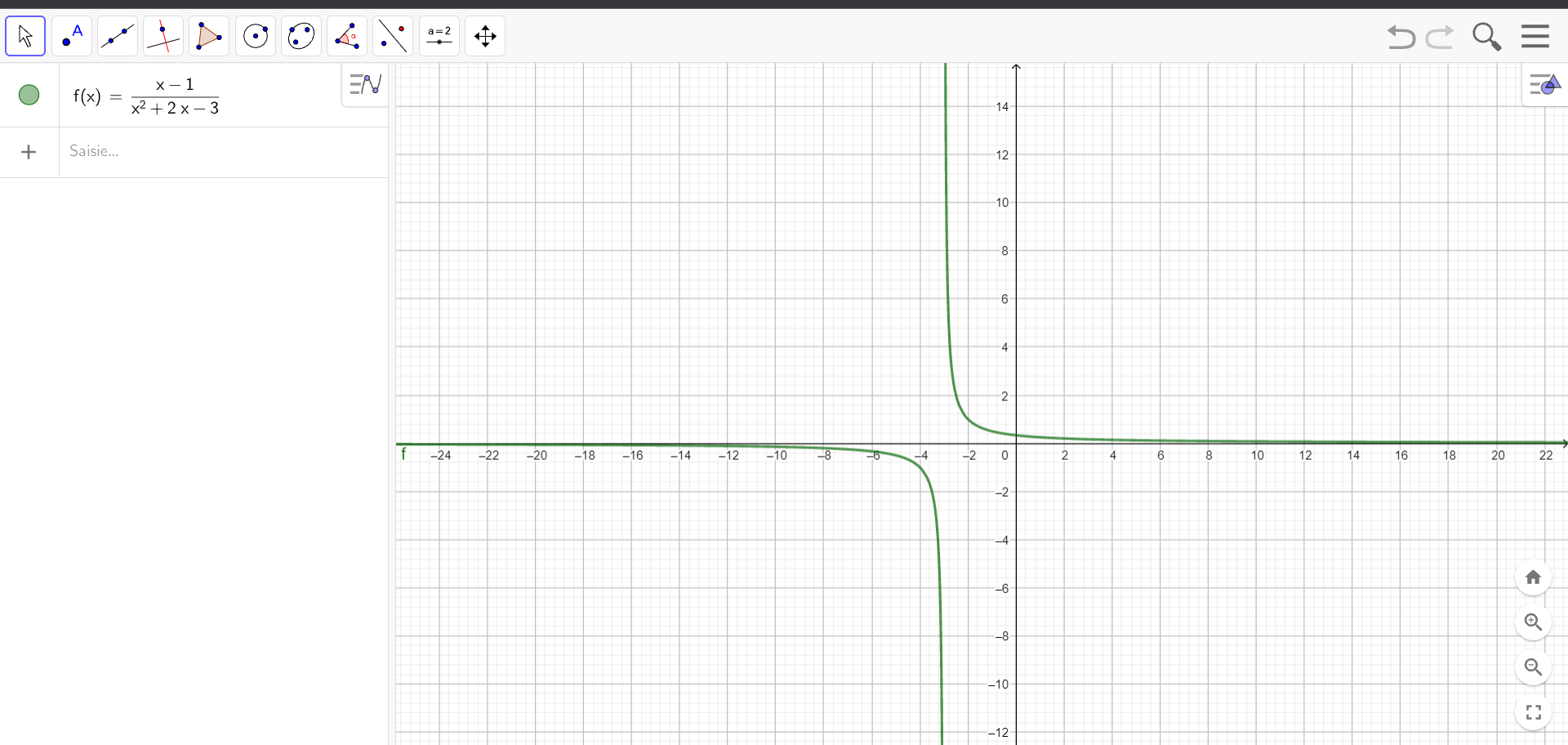 Or lorsque tu fais tendre x vers 1 dans cette expression, à droite comme à gauche, cette expression a une limite finie qui vaut 1/4, donc on peut prolonger par continuité la fonction f en 1 : ce qui donne une fonction g définie sur R, par f(x)=1/(x+3). C'est ce qu'a fait automatiquement GeoGebra.