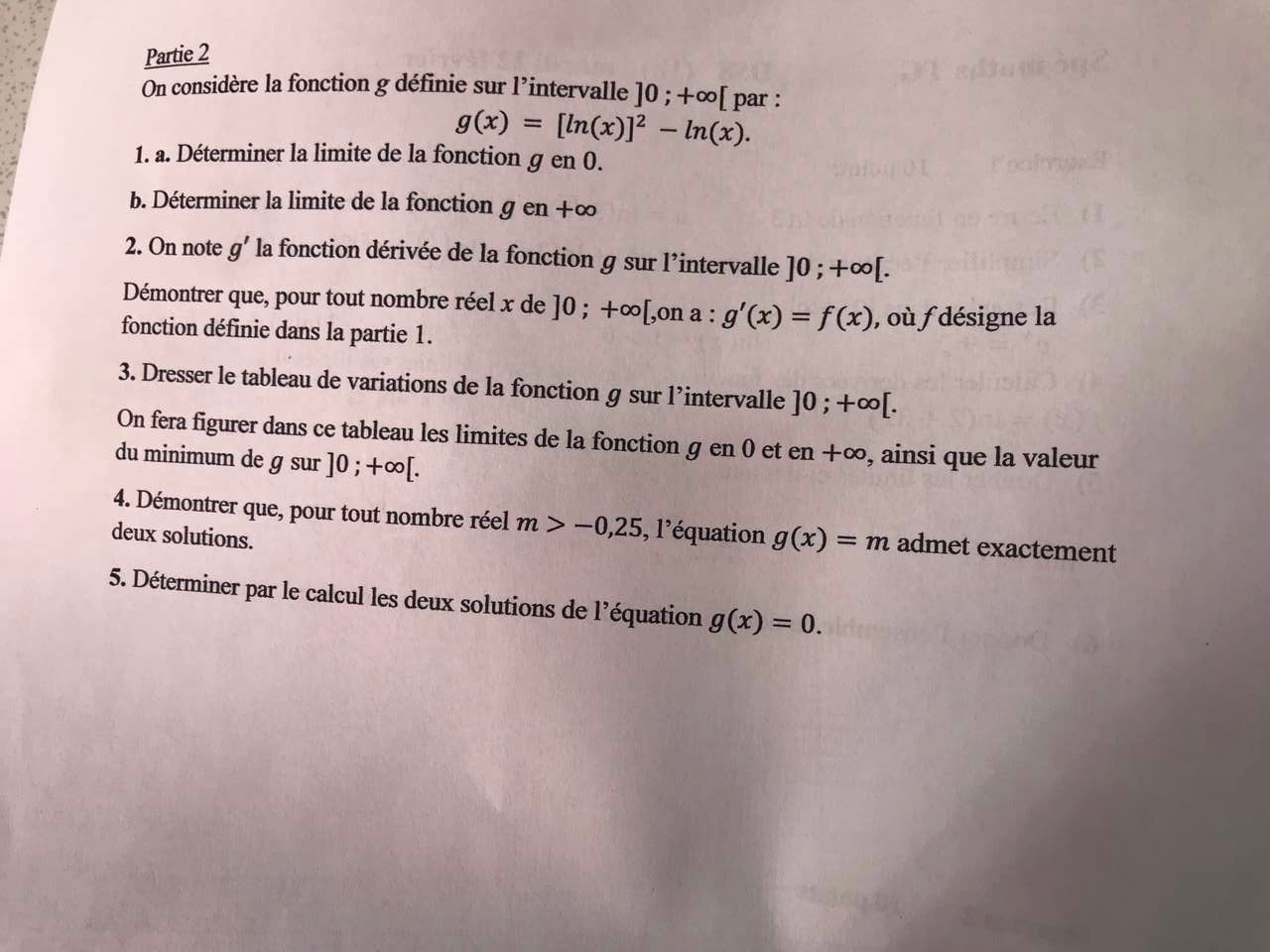 Question 1 (a et b). Tu as commis une erreur ... tu as écrit "lim(x->0) ln(x) = + oo" et c'est faux ... on a lim(x->0) ln(x) = - oo