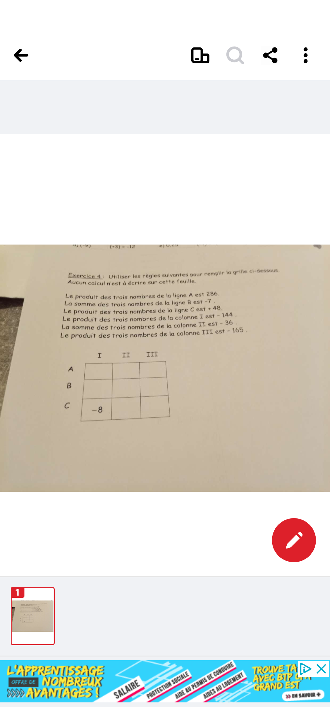 On te dit aussi que le produit des trois nombres de la ligne A est égal à 286 or 286 n'est pas un multiple de 3 donc il ne peut pas y avoir 3; -3 ; 6 ; -6 ;9 ; -9 ; 18 et -18 dans la case AI.