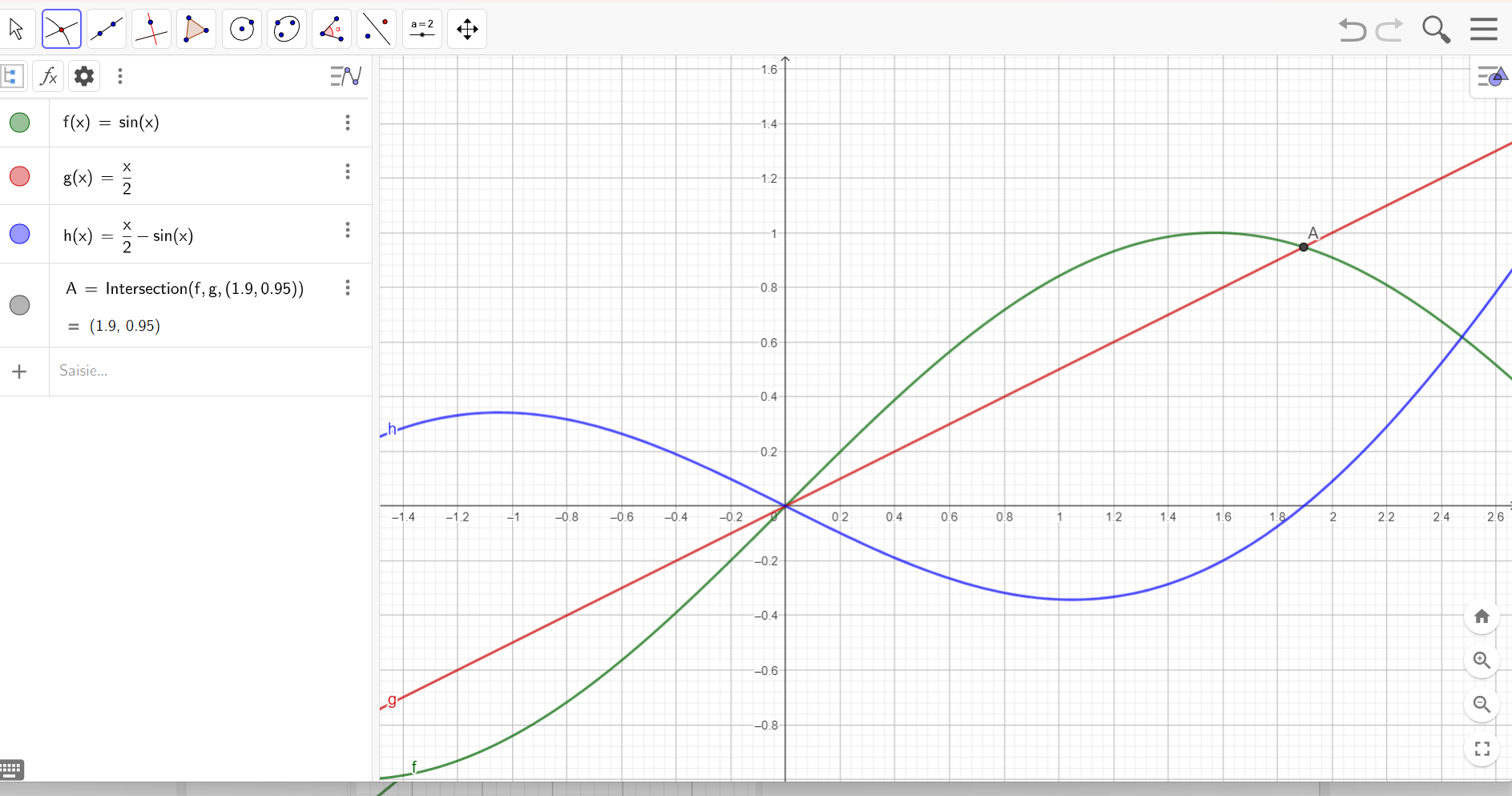 En revanche, on peut faire tracer f(x) = x/2 et g(x) = sin x et trouver le point d'intersection des deux courbes représentatives.