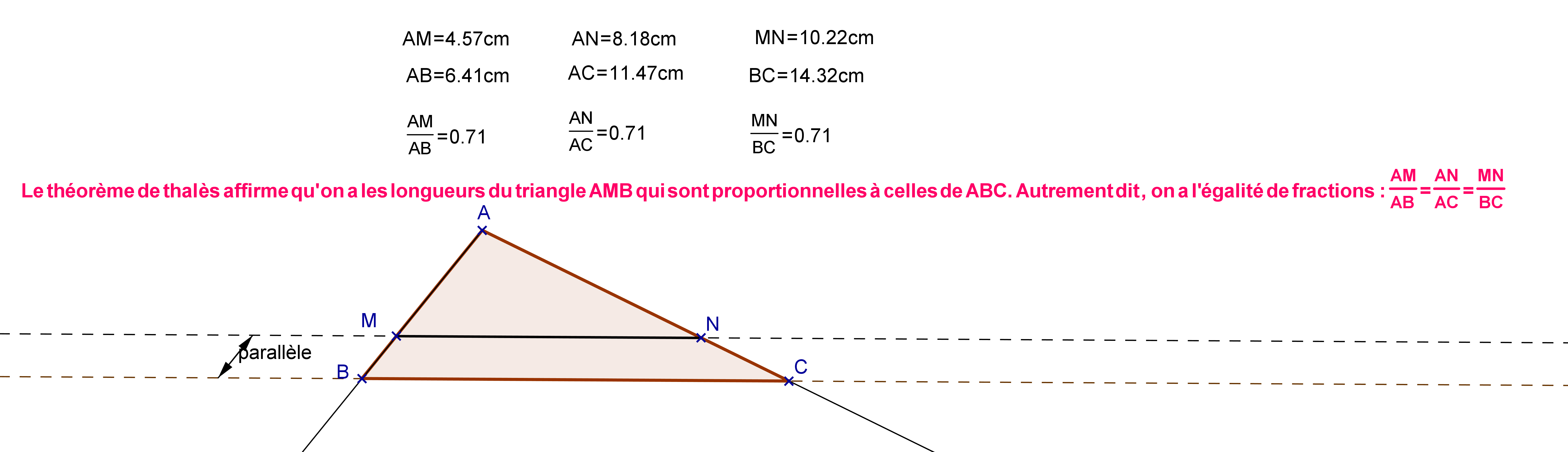 Je t'envoie cette figure pour l'exemple : Ainsi par exemple, si on a AB=8, AM=6 et MN=5, alors on peut calculer BC :