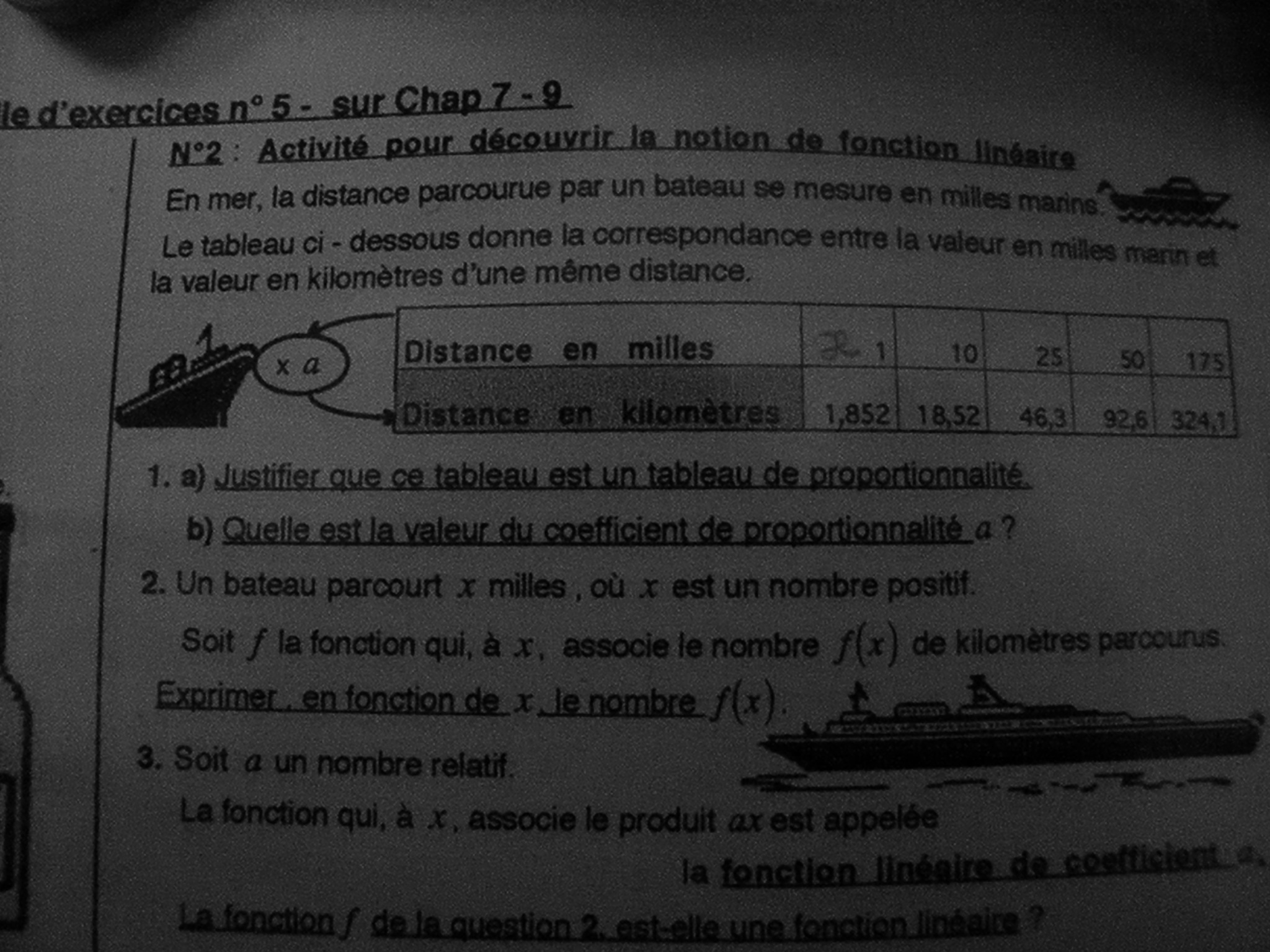 Donc si on parcourt \(x\) miles, cela revient à parcourir \(1,852x\) kilomètres donc \(f(x)=1,852x\).
