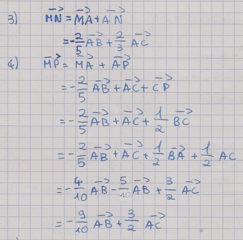 Le plus simple est de calculer \(\frac{9}{4} \vec{MN}\) à l'aide du résultat de la question 3). Après avoir développé et simplifier tu constateras que c'est égal à \(\vec{MP}\) à l'aide du résultat obtenu en 4). Bonne continuation.