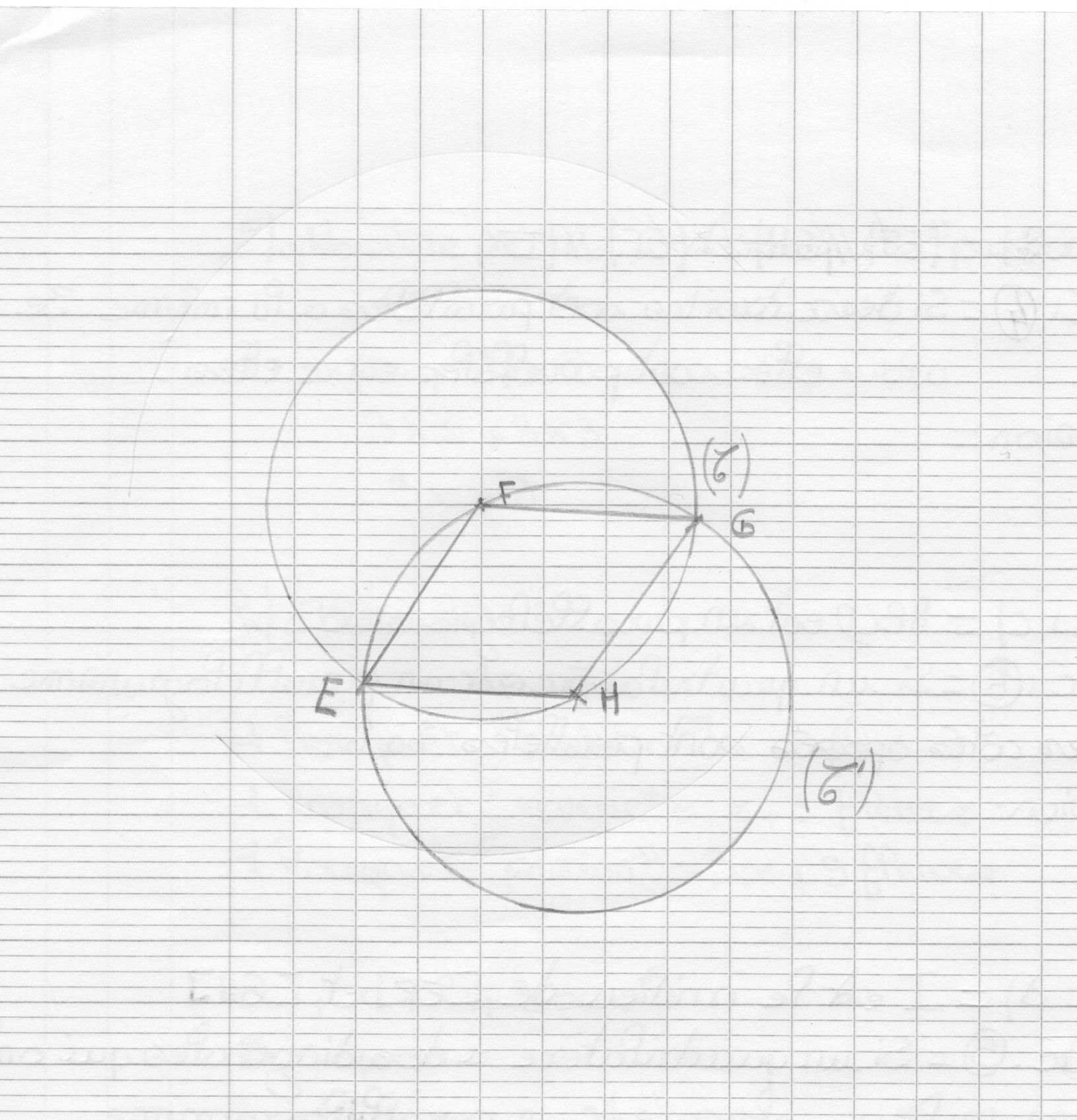 Soit (C) un cercle de centre F. Placer un point H sur ce cercle, tracer le cercle (C')de centre H qui passe par F, il coupe le cercle (C) en E et G.