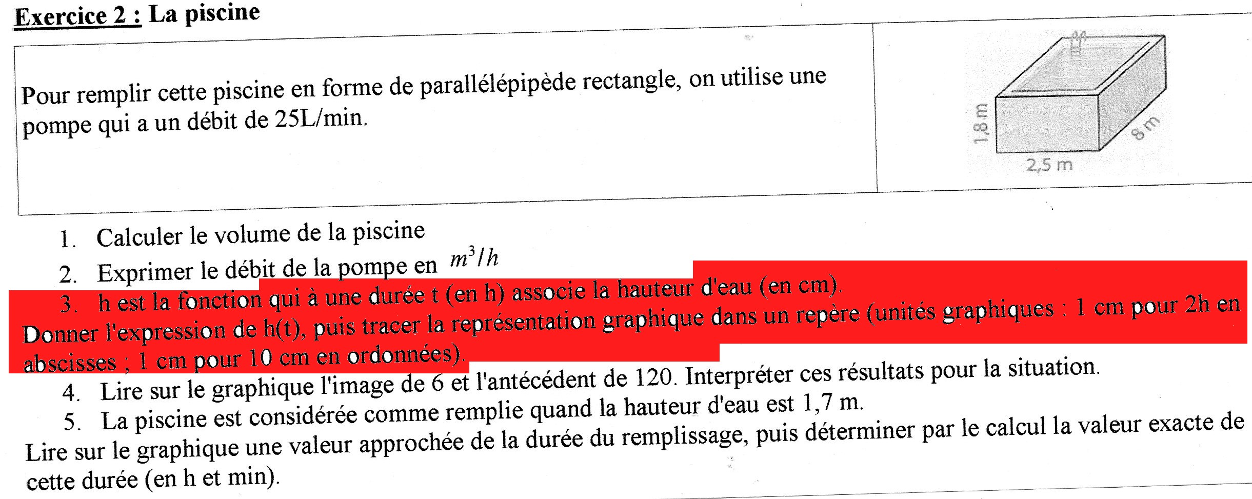 Le volume d'eau est le volume d'un parallélépipède rectangle de base 8 * 2.5 et de hauteur h(t) vous pouvez donc trouver une deuxième expression du volume.