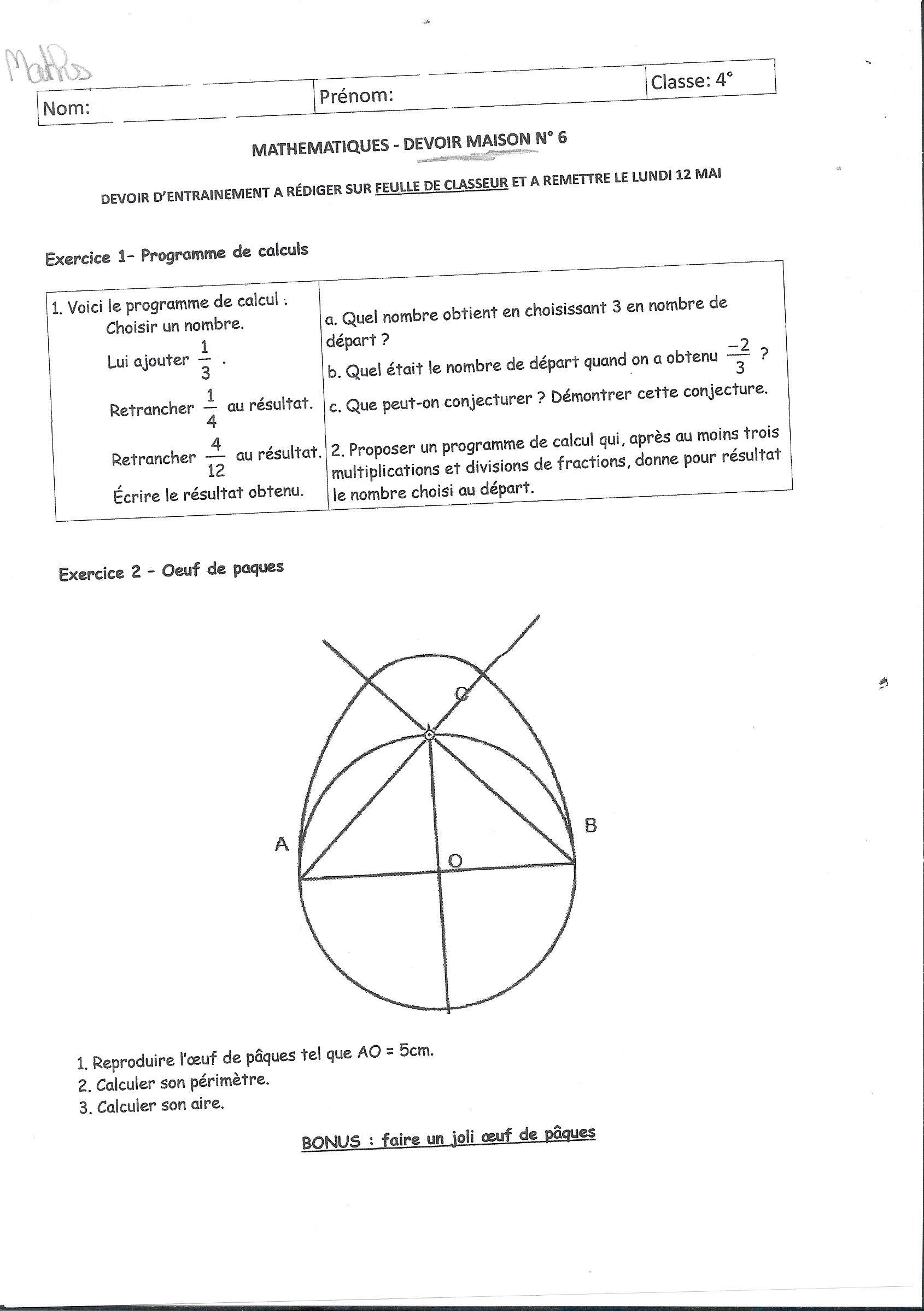 Bonjour, voila j'ai un devoir maison a faire mes je bloque a un endroit. Dans l'énoncé (voir fichier ci-joint (exercice n°2)) je doit reproduire un œuf de pâque tel que AO=5cm et après il demande calculer le périmètre et l'air de l’œuf, comment faire?
