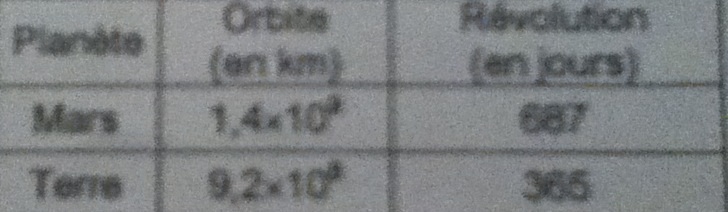 Bonjour,j'ai une question dans mon exercice de Math que je n'arrive pas a faire.Il faut trouver la vitesse de Mars et de la Terre sur leur orbite en km/h.