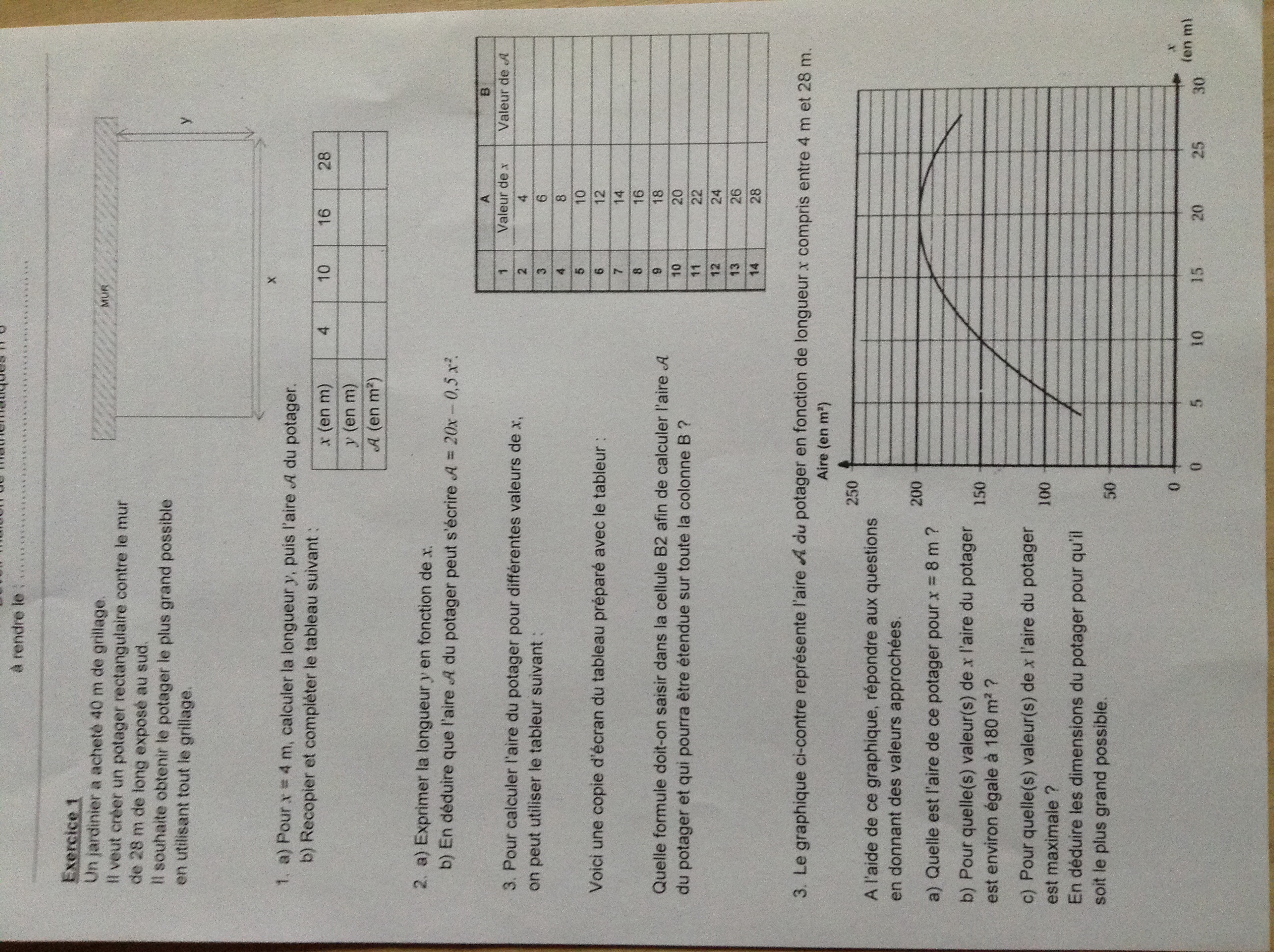 Les calculs ne semblent pas difficiles : pour \(x = 4\) il reste \(36\) m pour les deux "\(y\)" et \(y = 18\) donc l'aire est \(4 \times 18 = 72\)