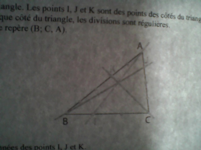 ABC est un triangle. Les points I,J,K sont des points des cotés du triangle, comme indiqué sur la figure ci-dessous. Sur chaque coté du triangle, les divisions sont régulières.