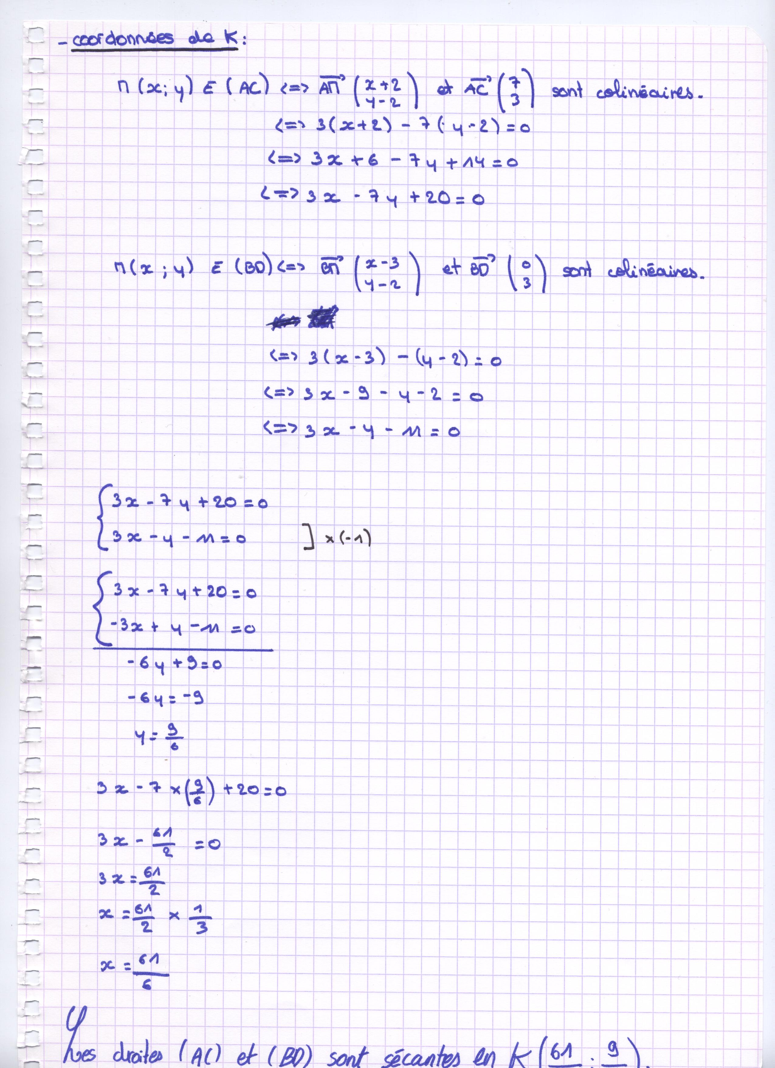 3.) Pour les coordonnées du points K, j'ai du faire une erreur de calcul mais je ne sais pas où ?