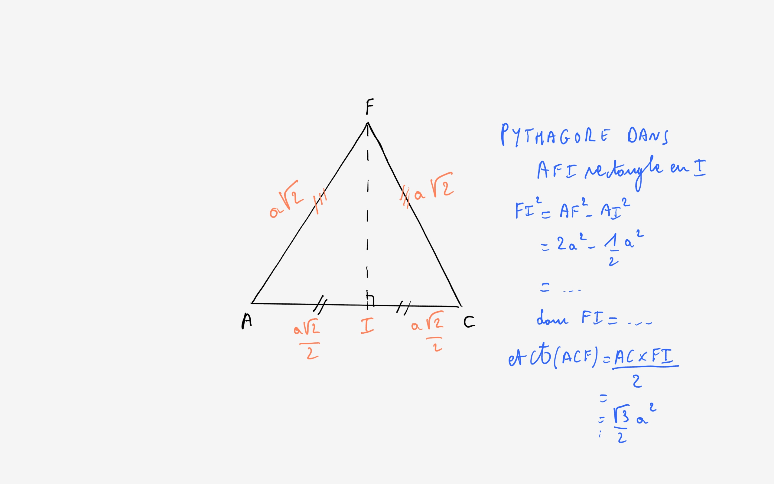 Considère ton triangle ACF : c'est un triangle équilatéral de côté \(a\sqrt{2}\) : applique le théorème de pythagore pour trouver la hauteur de ce triangle et en déduire l'aire de ce triangle.
