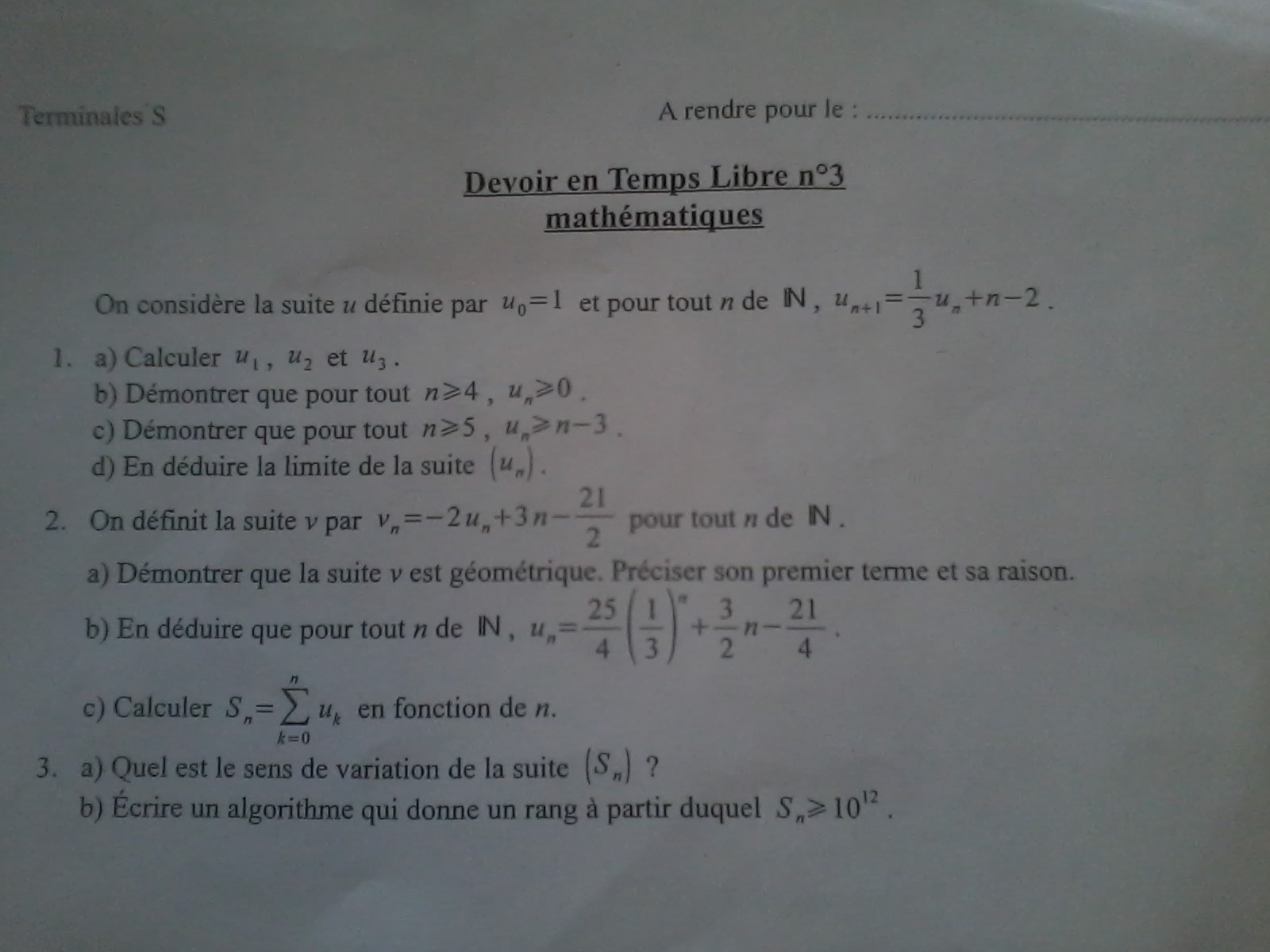 Bonjour, j'ai eu le même exercice à mon DM... dans mon cas, j'ai du mal à déduire que Un > n - 3 (donc la question 3) c)). Quelqu'un pourrait-t-il m'indiquer le chemin à suivre ?