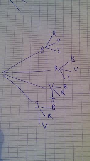 Il y a 16 issues possibles (c'est surtout pour l'arbre des possibles que je galère le probleme c'est que au deuxieme tirage si je met juste 3 issues a chaque fois , cela me supprime une couleur mais vu qu'on ne sais pas laquelle ca ne marche pas..)