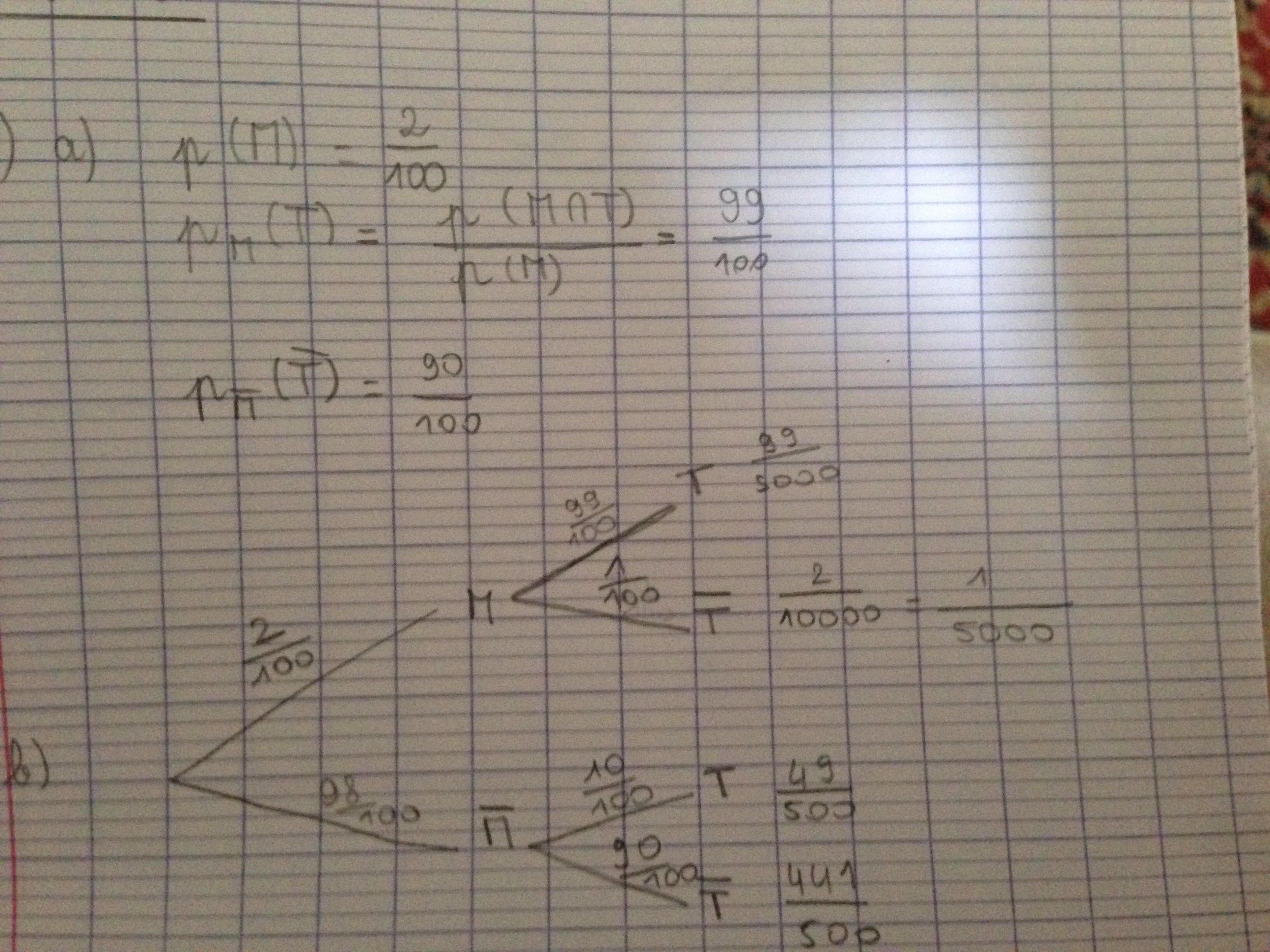 Voilà donc mon deuxième arbre complet ! Je trouve donc P(T) = 589/5000. <br /><br />Cependant, dans la question 1) d, le test est positif et il nous demande la probabilite que le sujet soit intoxiqué: je ne sais pas si je dois choisir Pt(M) ou P(T-inter-M) ? Je penche plus pour le premier...