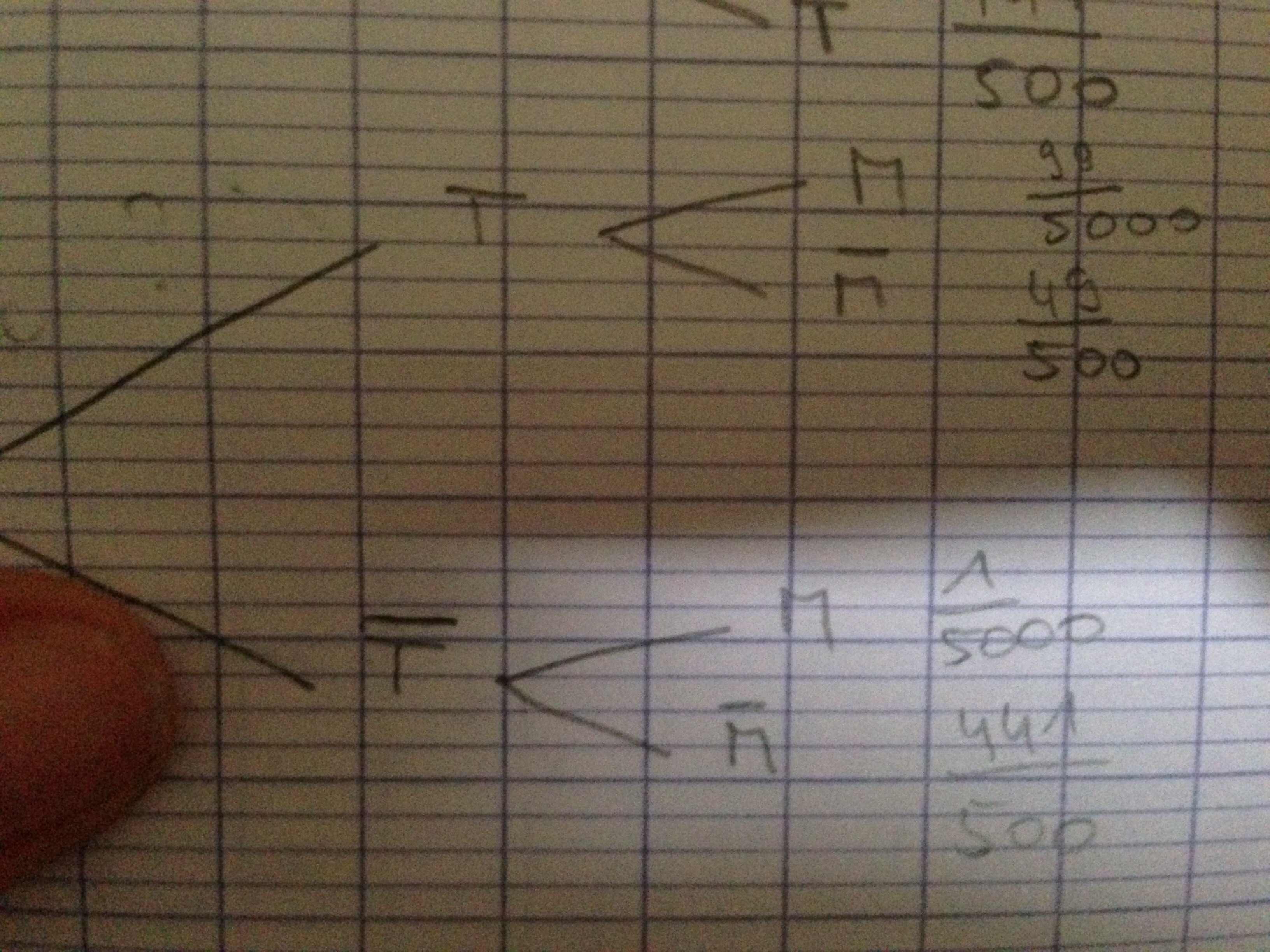 Voilà le premier arbre, je l'ai complété en entier, les probabilités a l'extrémité correspondant à P(M-inter-T)...<br />Mes probabilités sont-elles bonnes ?