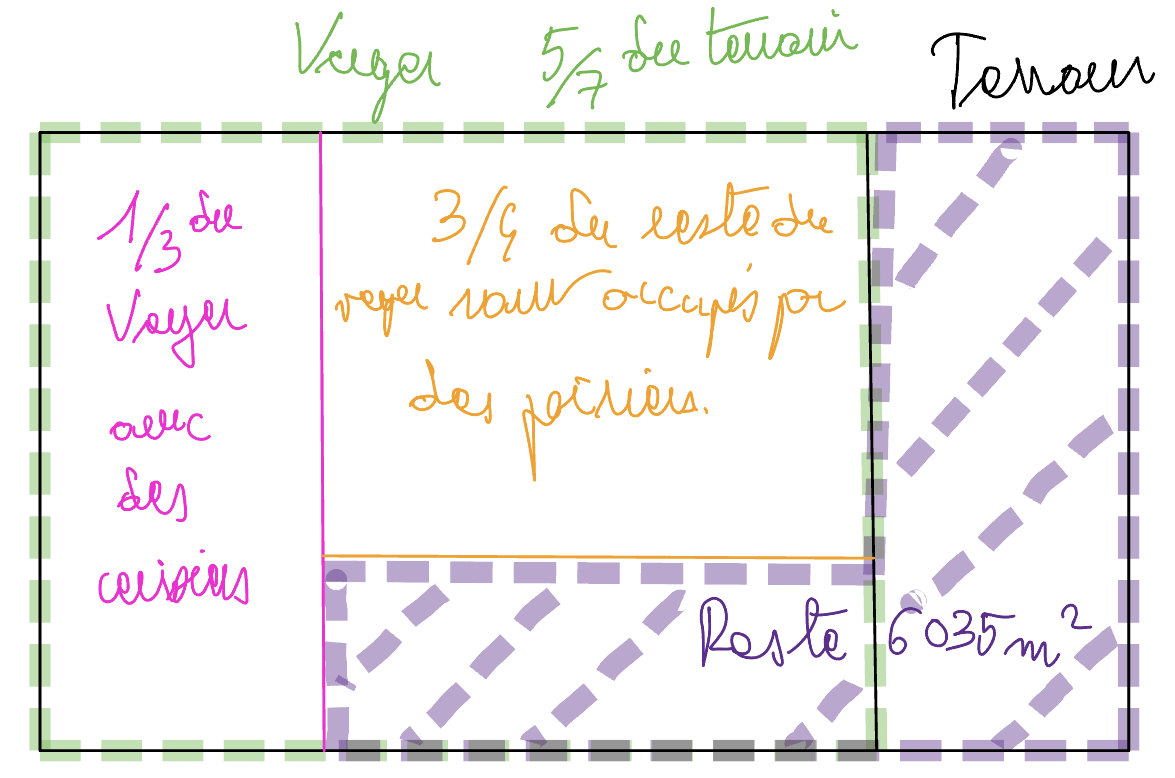 Donc le reste des arbres fruitiers correspond à 5/7 * 1/6 du terrain.