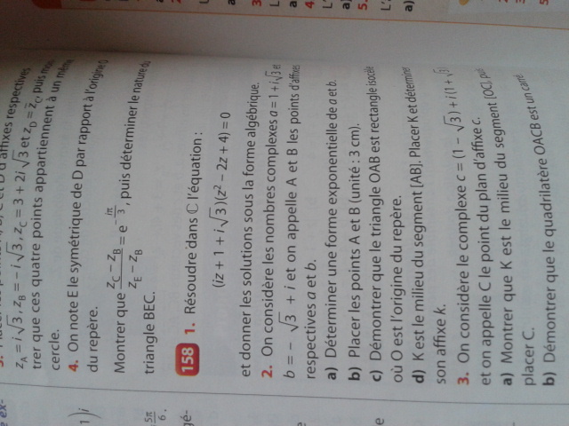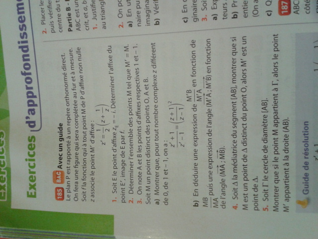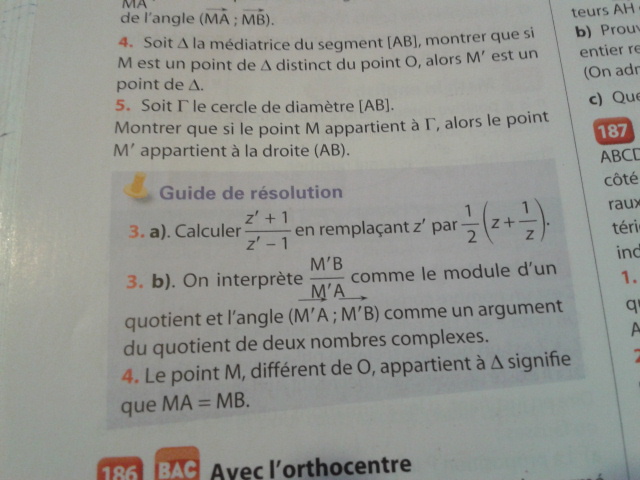 Pour le 3) b), il faut utiliser la définition de l'affixe d'un vecteur : en effet : z'+1 est l'affixe du vecteur \(\vec{BM'}\)