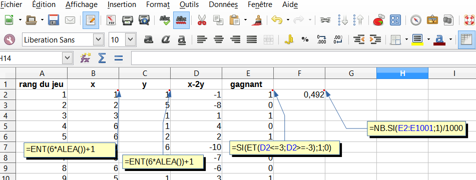 Pour t'aider, je t'envoie un exemple de copie d'écran de cette simulation avec des commentaires pour les formules tableur :