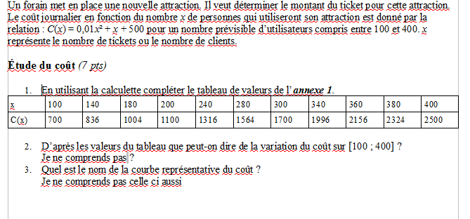 2. D’après les valeurs du tableau que peut-on dire de la variation du coût sur [100 ; 400] ?