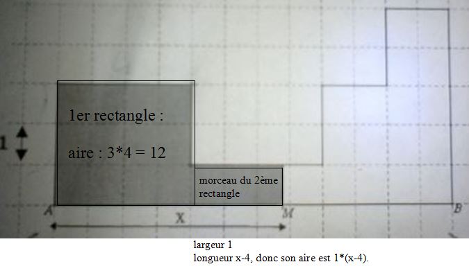Quand M est sur le côté du 2ème rectangle, tu as 4<x<8 et l'aire est celle du 1er rectangle + l'aire d'un morceau du 2ème rectangle (partie grise)