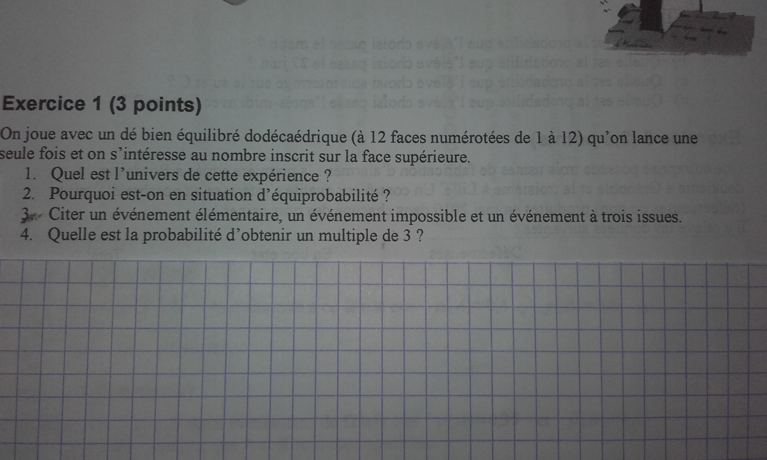 Pour la question 3, regarde dans ton cours la signification des mots "événement élémentaire", "événement impossible" ...