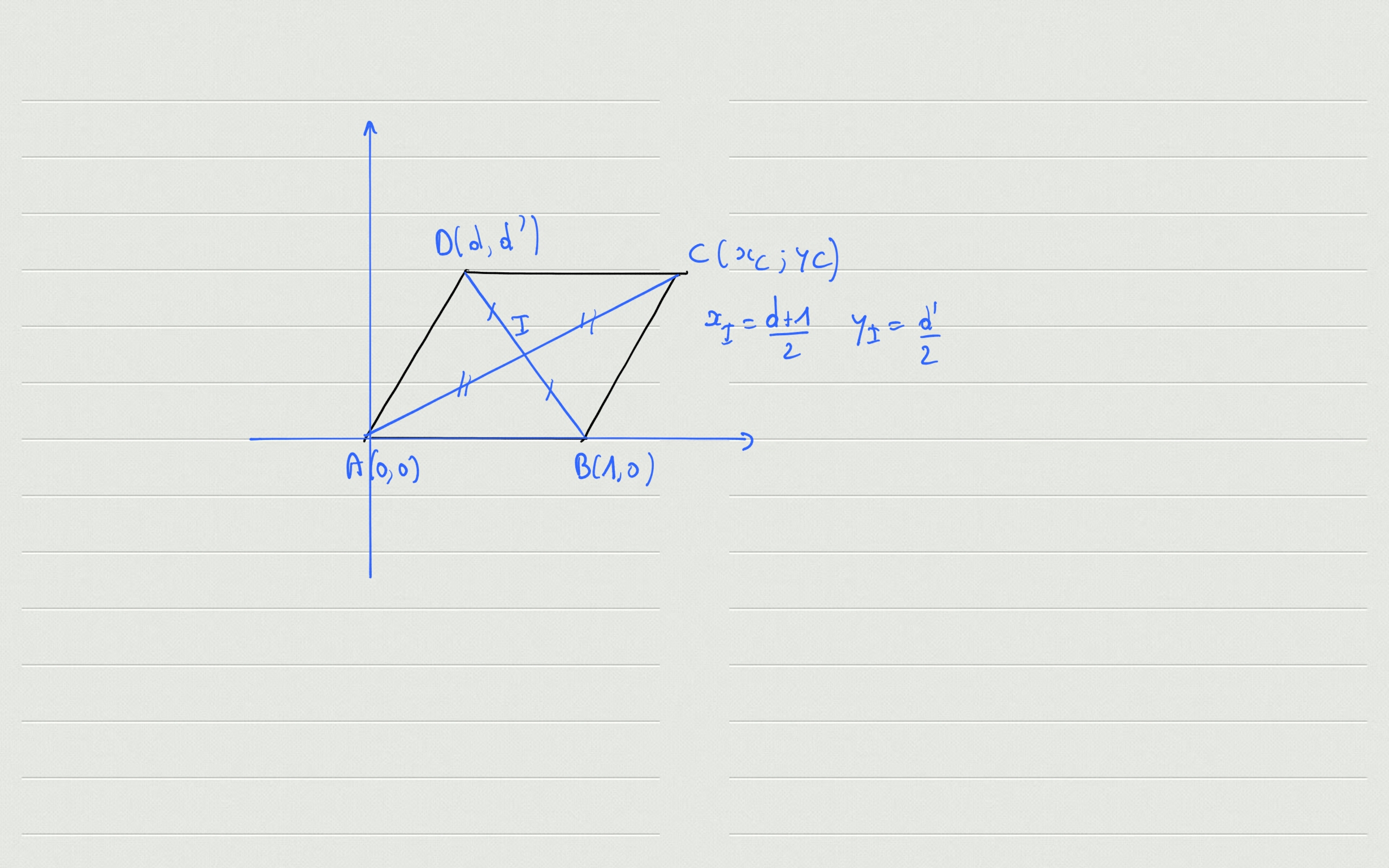 tu as bien \(x_I=\frac{d+1}{2}\) et \(y_I=\frac{d'}{2}\) en disant que I est le milieu de [BD].